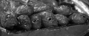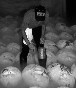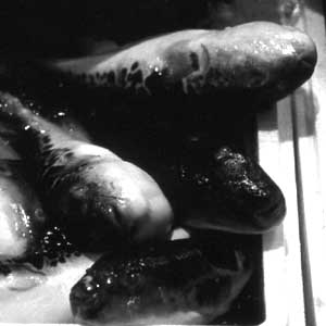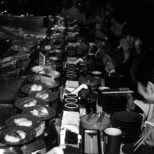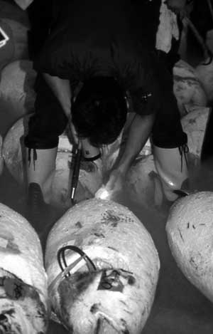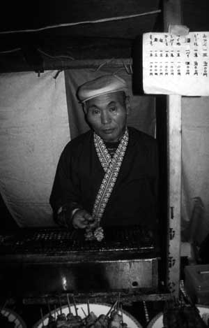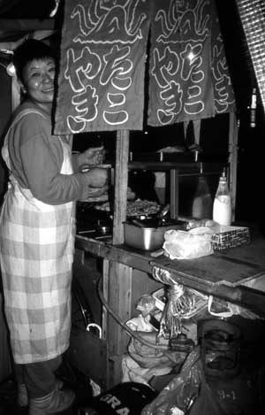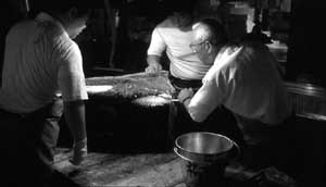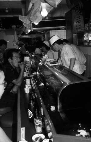 Allerdings mußten wir enttäuscht feststellen, dass das mehr eine Fleischbeschau ist als ein Nachtclub: OL (japanisch o-aru. was man mit office lady übersetzt) tanzen gelangweilt ein-Beinchen-links-ein-Beinchen-rechts auf zwei Podesten während die besoffenen sararymen (salarymen) im zerknautschten Büroanzug hechelnd, sabbernd versuchen einen Blick zu erhaschen - bei Rocklängen knapp über der Gürtelbreite sitzt die Geldbörse besonders locker ... Stefan machte den Vorschlag, uns einen besseren Überblick zu verschaffen, indem wir uns zu den Mädels auf den Tables gesellen. Ob´s lustig war? Nach nicht einmal zehn Sekunden bat uns ein freundlicher Securitytyp herunter und erklärte uns, dass man um droben herumgähnen zu dürfen, man einen Stempel auf dem Oberschenkel bräuchte ... und den dazugehörigen Rock ... ok. Das war auch schon der einzige Versuch sich unauffällig im angesagtesten Club Tokyo zu bewegen - ob er es allerdings immer noch ist, wage ich heute zu bezweifeln. Die ganzen Gaijin-Bars in Roppongi, angefangen mit dem berühmt berüchtigten Gaspanic, sind ohnehin zu vergessen, außer man steht auf amerikanische GI- und Loosertypen, die ein "always horny" auf die Stirn tätowiert haben. Sicherlich gibt es auch abseits vom Brennpunkt einige gute Lokale, leider sind diese ebenso der Mode und einem gewissen Verfallsdatum unterworfen wie alles andere in Tokyo auch. Apollo - find ich gut Tokyo Classified - Infomagazin von und für Ausländer in Tokyo - ist es immer Wert, dass man es sich beschafft. Besonders die Anzeigen über die neusten Bars und Clubs. Und so verschlug es meinen bayerischen Mitstreiter und meine Wenigkeit eines Tages nach Kita-Aoyama in das "Cyber Soul Space" Apollo. Unscheinbar im Keller eines Bürogebäudes mit Raumhöhen, die die deutschen Behörden sofort an die Decke gehen ließe. Und ... was noch Spaß machte, die Musik hörte nicht schon um Mitternacht auf wie im Velfarre, nein das muntere Treiben (endlich auch mal Typen ohne Krawatte und Mädels, die man nicht gleich nach dem Preis fragen würde) dauerte bis in die frühen Morgenstunden. Nicht, dass jetzt der Eindruck entsteht, das folgende fand auch an einen Samstag statt, nein, das war unter der Woche, Mittwoch oder Donnerstag ... unwichtig jedenfalls. In Japan gehört es sich neben der Erkundung des Sozialverhaltens der Ureinwohner nach Sonnenuntergang auch zum Pflichtprogramm, die Ernährungsgewohnheiten zu studieren. Unser (Stefan und meines) montägliches Sushiessen gegenüber dem Unicampus kann man schon als Ritual bezeichnen. Zuguterletzt kannte der Sushiyasan unsere Vorlieben oder fragte besorgt, was los sei, wenn ein Montag ausgelassen werden mußte. Auch 100Yen-guruguruzushi (auf Neudeutsch: running sushi) und hochklassige Ware gehörten zu unserem Speiseplan ... zum Leidwesen unseres Stipendiatenkontos bei der Fuji-Bank. Tsukiji - Fische, Fische, Fische, ... Selten bin ich so im Weg gestanden wie damals. Scherz beiseite, so schlimm war es auch wieder nicht. Man muß nur ständig Acht geben, dass einem diese flinken Motorschubkarren nicht in die Kniekehle rasen während man in die andere Richtung schauend verzweifelt versucht dem Dämmerlicht mit seiner Kamera Herr zu werden. Das äußerlich scheinende Chaos wird von eingen hundert lizensierten Händlern, Zwischenhändlern und Auktionären sowie nicht-lizensierten Touristen täglich auf´s Neue bis an die Grenzen ausgereizt. Letztere erkennt man daran, dass ihre Bewegungen zwar ebenfalls willkürlich in alle Richtungen verlaufen, dann aber eher ruckartig zusammenzucken, den Spritzern der motorisierten Ameisen ausweichen und den Fotoapparat ins Trockene retten. Gut, mit etwas Übung bekommt man das schnell in Griff .. oder auch nicht. Gebimmel - Geschrei - Gebimmel - verkauft! Sollte jemand glauben mit bestandenem Japan Language Proficiency Test (Niveau 1) und Schwarzem Gürtel in japanisch Fluchen ist er nun reif um auf die lieben Japaner losgelassen zu werden, so muß ich ihn nun enttäuschen. Das wohl beeindruckendste Schauspiel japanischer Sprache wird wohl für die meisten von uns ein ewiges Buch mit Sieben Siegeln bleiben: die Versteigerung der Thunfische! Nachdem die Qualität des gefrorenen (manchmal auch rohen) Megaherings anhand eines Lutschtests in Yen erschmeckt wurde, haben nun einige Händler die Möglichkeit mit verrenkten Fingern und anderen Handzeichen innerhalb von wenigen Sekunden das Fischlein zu ersteigern. Der, der den Hammer schwingt, oder besser gesagt hier die Glocke bimmelt, startet das Schauspiel, brüllt unverständliches Zeug (abgesehen von der unglaublichen Geschwindigkeit seiner Zungenfertigkeit) und bimmelt keine zwanzig Sekunden später den Verkauf ein. Das wiederholt sich einige Male - jedesmal das gleiche Procedere - der freundliche Herr mutiert zum aderntreibenden Rothaupt und chilled locker wieder mit Weihnachtsglocken aus. Was nun passiert ist zwar weniger spektakulär, aber genauso interessant: das Filletieren des Silberlings mit Schwert-ähnlichen Messern oder für die "verfrorenen" Kollegen mit elektrischen Bandsägen. Bei den diversen Großhändlern findet man dann die ganze Palette japanischer Speisekarten, tot und lebend. Der Oktopus, der eben noch für ein paar Scheinchen den Besitzer wechseln sollte versucht einen Ausbruch und schlabbert unbeholfen auf allen Achten Richtung ... nix da! frisch - frischer - lebend Bei Katoh, dem Sushi-Restaurant am Fischmarkt, ist schon um 5 Uhr die Hölle los. Allerdings habe ich dort niemals Ausländer gesehen. Liegt es daran, dass wir Europäer (und Amis und Aussies und ...) um diese Zeit lieber ein Müsli frisch aus der rechtsdrehenden Mühle reiben? Katoh ist nicht gerade billig, aber betrachtet man die Entfernung zum Fischernetz, der frischeste siner Zunft (so ziemlich). Alles was das Herz begehrt und der Magen gerne auch weider verkehrt austülpen würde, kann man hier finden. Johnny, ein befreundeter Fotograf, besuchte einst mit mir dieses Lokal (mein er