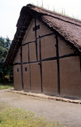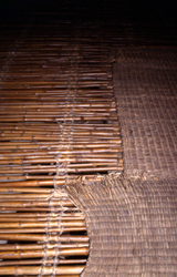 obwohl nicht gerade ein widerstandsfähiges Material (hinsichtlich Klima) ein sehr beliebtes Baumaterial für die Ausfachung der Holzständerbauweise, dürfte der Lehm gerade wegen seiner Textur und Farbe sehr beliebt (gewesen) sein; shita nuri (Kern) auf das Bambusgefecht |