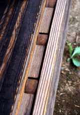 | die wichtigsten Holzarten: hinoki (Scheinzypresse, Chamaecyparis obtusa): gerader Wuchs, widerstandsfähig gegen Fäulnis, hart, feine Maserung: teures Holz, daher Verwendung nur für besondere Bauteile akamatsu oder mematsu (Rotkiefer, Pinus densiflora) und kuromatsu (Schwarzkiefer, P. thunbergii): hohe Elastizität und harzreich, daher vor allem Verwendung für Bauteile, die dem Regenwasser ausgesetzt sind keyaki (Zelkovie): hart, lebhafte und kontrastreiche Maserung und daher sehr dekorativ daneben bzw. hauptsächlich findet man andere Kiefern- und Tannenarten, die häufiger vorkommen; für besondere Bauteile werden auch besonders teure Hölzer verwendet wie momiji (Ahorn) kuri (Nußbaum) kuwa (Maulbeerbaum) take - Bambus (verholzendes Gras): viele verschiedene Arten; Verwendung finden vor allem Arten von Phyllostachys (miti, bambusoides, puberula); beliebt ist der Bambus nicht nur wegen seines praktischen Nutzens (hohl), sondern auch weil er aufgrund seiner Erscheinung (rund, glänzende Oberfläche, Farbe) als Kontrast zum matten, kantigen Holz eingesetzt werden kann wird verwendet als Ausfachung und Putzträger, Bodenmaterial für Veranden, Regenrinnen und Wasserleitungen, für Fenstergitter und Vorhangmaterial, aber auch als Konstruktionselement (Pfosten der tokonoma) und im klassischen Teehaus, Dachkonstruktionen usw. |