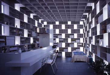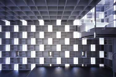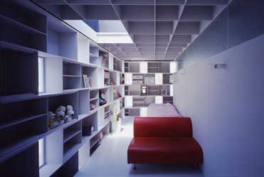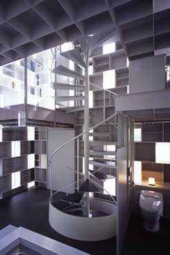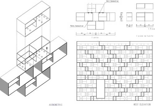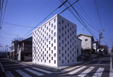 void masonry This unique building is situated somewhere in a quiet residence area in Tokyo. Well, at a first glance it looks like an (more or less) ordinary house made of concrete. But in fact it´s made of single prefabricated steel boxes like a what Yamashita calls "void masonry". These boxes can also be used as a storage, shelves and so on. 900x450x300mm large boxes with a thickness of 9mm define the module structure. The single units were brought to the site as prefabricated larger units of 5 to 6 boxes, fused together with high tension bolts, with an opening for the window. Yamashita Yasuhiro envisioned creating a dappled light effect like the sunlight that pours through the tree leaves. Three people live there: a woman in her fifties with her two children. |