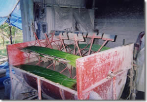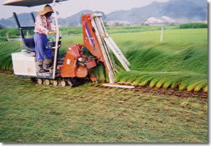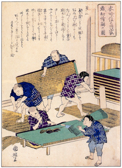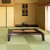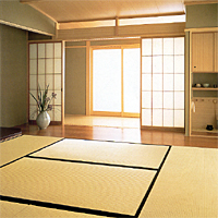 | 1.1 das Maß aller Dinge Seit der Heian-Ära ist die Tatamimatte als Bodenmaterial bekannt. Erste Erwähnung fand es bereits in den Koji Ki ( frei übersetzt: Aufzeichnung historischer Angelegenheiten) 712nChr, wonach in der Zeit des Kaisers Jimmu (6.Jhdt. v.Chr.!) erste tatami-ähnliche Matten verwendet wurden. Ursprünglich wurde der Begriff tatami für Teppiche aus Wolle und Matten zum Sitzen und Schlafen verwendet. Nachdem diese Materialien obligatorisch in den Häusern der wohlhabenden, aristokratischen Leute wurden, bezeichnete tatami alles, was gefaltet (tatamu) oder schichtweise gelegt wird (Herstellung). Die 732 nChr im Wamyou Ruiju Shou erwähnten tatami dürften aber eher mit den heute wieder mehr gebräuchlichen dünnen Tatami, den usu-tatami, gleich zu setzen sein als mit den bekannten dicken. Das heutige Erscheinungsbild der tatami dürfte aber in der Heian-Periode geprägt worden sein, als sie einfach auf den Holzfußboden gelegt wurden um darauf zu sitzen (1/2-tatami) oder zu liegen (ganze tatami). Die Größe war noch nicht standardisiert und hing mehr oder weniger vom Reichtum des Besitzers ab. Während der Kamakura-Ära entwickelte sich aus dem shinden-zukuri (Baustil) der Heian-Zeit der shoin zukuri der Samurai und Priester und fand seinen architektonischen Höhepunkt in der Muromachi-Zeit. Die mit Holzdielen ausgestatten Räume wurden nur am Rand mit tatami ausgelegt; kleinere Räume (die nun immer mehr aufkamen) wurden komplett ausgelegt. Räume, die flächendeckend mit den Matten ausgelegt waren, nannte man zashiki. Nun begann man auch sich Gedanken über das Layout zu machen und stellte Regeln hierfür auf: "...die korrekte Art die tatami zu legen, ist es sie rund herum (entlang der Wände) anzuordnen, unabhängig wie viele. Die tatami vor der toko (heutzutage fälschlicherweise tokonoma bezeichnet - dies bedeutet eigentlich das Zimmer mit der Nische) sind immer längs dazu zu legen ..." (frei übersetzt aus dem shakuhei ki (1532-69). Während der Edo-Ära wurden - natürlich - neue Richtlinien erstellt, wohl den neuen Moden aber auch Ansprüchen gerecht zu werden. Die Standardisierung der Matten ermöglichte es nun, diese den Anlässen entsprechend umzulegen. Einen großen Einfluß auf den Gebrauch von tatami hatte die Kunst der Teezeremonie, die im Übergang von der Momoyama-Ära zur Edo-Ära ihren Aufschwung hatte. Erst in der Mitte der Edo-Zeit (um 1750) fand die tatami Einzug in die bürgerlichen Häuser, auf dem Land dauerte diese Entwicklung bis in die Meiji-Zeit. Interessant ist die Beobachtung in den kaiserlichen Anlagen und Gebäuden der daimyo: der Ort , an dem die Herrscher sitzen befinden sich tatami, die eine 2-3-fache Stärke der normalen Matte haben. Sie sind auch von ihren Abmessungen her anders und liegen auf den herkömmlichen tatami. 1.2 tatami als Standard Die Lehrmeister der Teezeremonie suchten sehr schnell den Weg der einheitlichen Größe, da diese in der Architektur der Teehäuser bzw. -zimmer, chashitsu, eine besonders bedeutsame Rolle spielen soll. Wie auch in anderen Ländern, wo bestimmte Materialien eine Normierung erfuhren (z.B. der Tonziegel in Deutschland), gab es regionale Abweichungen und Besonderheiten. Diese zeigen sich zum einen in der Größe als auch in der Art der Einfassungsbänder und Oberflächen. die wichtigsten Größen sind: kyouma-datami: 6shaku5sun x 3shaku2,5sun (1970x985mm) chuuyouma-datami: 6shaku3sun x 3shaku1,5sun (1909x955mm) inakama-datami: 6shaku x 3shaku (1818x909mm) edoma-datami:5shaku8sun x 2shaku9sun (1757x879mm) Die Stärke der Matten variiert zwischen 2sun in der Kanto-Region und 1sun und 8bu in der Kansai-Region; tatami der besten Qualität (nicht aristokratisch) sind 2sun5bu stark. Abhängig von der Dicke der Matte richtet sich die Breite der Einfassungsbänder. Dass diese Standardisierung nicht nur Vorteile hatte, zeigte sich vor allem in der Praxis, wenn z.B. verschieden große Räume aufeinander treffen oder die Holzkonstruktion des Gebäudes sichtbar blieb. In diesem Zusammenhang sei noch zu erwähnen, dass die Japaner wohl die einzigen auf der Welt sind, die Räume nach der Art der Auslegung des Bodenmaterials, benennen. Den Höhepunkt dieser Klassifizierung sieht man in den Bezeichnungen für Teeräume, die z.B. für einen 8 Matten großen Raum mindestens 4 verschiedene Namen kennt. Tatami definieren sich durch die drei Bestandteile: toko (quasi der Kern): aus Reisstroh omote (die Oberfläche): aus igusa bzw. toushingusa (Juncus effusus) oder kayatsurigusa (Cyprus microiria) fuchi oder heri (die Einfassung): Bänder aus Stoff Die Farbe und das Muster der Einfassungsbänder richteten sich nach dem Stand der Person. So bekam der Kaiser Brokateinfassungen mit großornamentalen Blumen und Diamantenmuster während z.B. die Priester eine purpurrote Einfassung hatten. Doch diese Regel wurde schon bald wieder eingestellt und so findet man heute eine breite Auwahl an heri, einfarbig und gemustert. 1.3 Herstellung Wenn sich die Halmspitzen von Juncus effusus braun färben, beginnt die Erntezeit der Flatterbinse, igusa, oder auch Dochtbinse, toushingusa, da früher der Halm für den Docht von Laternen und Öllampen Verwendung fand. Der Anbau ist dem des Reis' sehr ähnlich und unterscheidet sich nur durch die Zeit des Auspflanzen der Jungpflanzen. Das Ernten erfolgt maschinell, höchste Qualität wird noch mit der Hand geerntet. Nach der Erntemahd werden die Halme in eine Lehm-Wasser-Lösung getaucht und zwei Tage an der Sonne getrocknet. Dies gewährleistet eine bessere Haltbarkeit. Die omote werden auf Webstühlen hergestellt. Das Reisstroh für die Basis wird ein Jahr getrocknet und in mehreren Lagen kreuz und quer verarbeitet bis 40cm starke Rohmatten entstanden sind, die anschließend auf 5cm gepresst werden. Dies erklärt das hohe Gewicht von 40kg einer tatami. Billige tatami bestehen in ihrem Inneren nicht mehr aus Reisstroh sondern Hartschaumstoff, die auch dementsprechend leichter sind. 1.4 kl