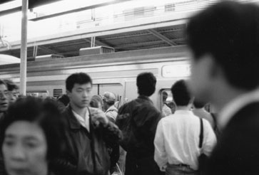| Seit ich in Tokyo einer halbwegs geregelten Arbeit nachgehe, sehe ich mich auch mit der täglichen Zugfahrt von Koganei stadteinwärts und abends retour konfrontiert. Es gibt kaum Möglichkeiten, einer Stoßzeit aus dem Weg zu gehen - ich unterliege demselben Problem wie die Mehrheit aller Tokyoter: der Arbeitsplatz liegt eine Stunde vom Hause in der falschen Richtung. Macht also zwei lebenswerte Stunden aus, die ich meist mit äußerst eingeschränktem Aktionsradius im Zug ver-stehe; zwei Stunden, die bei aller Beengtheit nicht ganz unkreativ vergehen... In Musashi-Koganei ist zu meiner Abfahrtszeit morgens die Hölle los. Nicht daß der Bahnhof als solches überlaufen wäre - der Bahnsteig ist durchaus erträglich dicht. Jedem Fahrgast bleiben durchschnittlich mehrere Quadratmeter Bewegungsfreiheit zur Verfügung. Hält allerdings der Zug, ist er bereits vollgepackt - so, daß man als Europäer lieber auf den nächsten warten würde, ahnte man nicht, daß dieser ähnlich beladen sein würde. Dummerweise habe ich um diese Zeit noch nie jemanden in Musashi-Koganei aus einem Zug stadteinwärts aussteigen sehen... Den Gedanken an einen Sitzplatz habe ich bereits bei meiner ersten Fahrt im Keim erstickt. Ich freute mich über jede Chance, einen guten Stehplatz zu erwischen. Die besten befinden sich unmittelbar an den (besetzten) Sitzbänken entlang der Fenster, in einiger Entfernung von den Ausgängen. Hier genießt man zum einen freie Atmungsmöglichkeiten, zum andern den Vorzug von Halteschlaufen, die einen die persönliche Gleichgewichtssituation eigenständig kontrollieren lassen. Andernfalls ist man mehr oder weniger der Disziplin seiner Mitfahrer ausgeliefert. Mikrokosmos der Geräusche Während man sich optischer Beleidigungen ganz einfach erwehren kann, wenn man die Augen schließt, reichen bei akustischer Reizüberflutung die körpereigenen Abwehrmechanismen nicht mehr aus. Da benötigen wir Menschen technische Krücken, Schaumstoff im einfachsten Fall. Das zeitgenössische Wundermittel aber heißt Walkman und zeichnet sich dadurch aus, daß man sich mittels seiner Lieblingstapes ganz einfach in Traumwelten katapultieren kann, die einem die Bilder der Realität versüßen. Während der täglichen Zugfahrten hinterlegte ich gerne meine optischen Eindrücke mit Musik; die Augen schloß ich selten bewußt, nur, wenn ich durch das gleichmäßige Rumpeln des Zuges schläfrig geworden war. Ich liebte es, aus dem Fenster zu sehen und aus der Realität durch Töne allerlei Gedanken zu schöpfen um sie in einen fast einstündigen Film hineinzuimprovisieren. Heute hatte ich aber meinen Walkman zu Hause vergessen. Das war ein Fehler, denn die Geräusche der erkälteten Zeit breiteten sich mit unerbittlicher Lautstärke im Bahnabteil aus. Ich hatte oh Wunder! - einen Sitzplatz in dem Morgenzug um fünf nach halb neun und wurde Zeuge einer Geräuschkulisse, die ich sonst einfach ausschaltete. Husten, Schniefen und - da stand dieser Typ vor mir, "the chewer" nannte ich ihn, der geräuschvoll auf seinem Kaugummi herumbiß, schlurzte und seinen Mund dabei nicht schließen wollte. Ich fürchtete, daß er mir ins Gesicht spuckte. Diesen Anblick konnte ich nicht ertragen und schloß meine Augen. Die Töne, die er dabei von sich gab, konnte ich nicht verdrängen. Unfähig, friedlich entschlummern zu können, öffnete ich meine Augen wieder und warf ihm wütende Blicke zu. Mein Vorwurf rutschte glatt an seiner ausdruckslosen Mine ab. Noch nicht einmal fragend sah er mich an... Ob ich wollte oder nicht, mußte ich diese ungeheuere Portion Ignoranz verdauen versuchen, gleich ob sie aus kulturellem oder persönlichen Unverständnis herrührte. Er widerte mich an. Sabbersonate aus einem dumpfen Gesicht stieren Blickes. Ich fühlte mich dafür zu lebendig! Inzwischen hatte sich der Japaner neben mir zu Wort gemeldet. "The reader", ein etwas ungepflegter Typ mit nackenlangen, graumelierten Haaren und dem fashionablen Dreitagesbart las fashionable englische Klatschzeitschriften ungewohnt hohen sprachlichen Niveaus. Er schien tief in seinen Text versunken zu sein; vielleicht auch in die Musik, die er gerade hörte. Wahrscheinlicher schien mir, daß er meine Aufmerksamkeit erregen wollte - "höre, gaijin, Du! Ich kann auch englisch..." und in halbwegs verstümmeltem, aber erkennbaren englisch begann er mir eine Lesung zu halten. Ein Säuseln mehr... Walkmangeräusche. Signale des anfahrenden Zuges. Der Herr links neben mir schläft den Schlaf der Gerechten. Ich beneide ihn. In liebevollem Einvernehmen Heute traf ich auf einen äußerst freundlichen Japaner... Ich war aufgewühlt. Meine Mutter hatte mir einen besorgniserregenden Fax über ihren gesundheitlichen Zustand geschickt. Ich stand auf einem soliden Podest vor einem Abgrund, der mir - Nichts - verhieß und Sandy Denny im Walkman, die ich über die Kulisse Tokyos gestülpt hatte, half mir dabei. Es war ein Donnerstag abend - der einzige Abend der Woche, an dem mein Freund John auswärts übernachtete. Normalerweise genoß ich diesen Spielraum ganz für mich alleine zu sein - heute hätte ich mir jemanden zum Reden gewünscht. Der junge Kerl, bebrillt und liebenswert, einer, offensichtlich auf dem Weg zum Intellektuellen, setzte sich neben mich und las in seinem japanischen Taschenbuch. Dieses war - wie in den meisten Fällen - in Papier eingewickelt und gab nichts von seinem Inhalt preis. Ich blickte ihm über die Schulter und testete mich, wie schnell ich mitlesen konnte, und ob ich einige inhaltliche Fetzen auffangen konnte. Obwohl ich gelegentlich einnickte, wendete er sich mir freundlich zu und hielt mir sein Buch zum Mitlesen hin. Ich drehte meinen Walkman etwas lauter und ließ ihn dafür mithören. Als ich ausstieg, lächelten wir einander freundlich zu. Der fremde Freund Heute, Freitag mittag, sprang ich geschwind in Shinjuku in den Zug nach Hause. Der Zug war halbwegs voll. Ich schlüpfte auf den freien Sitzplatz, bevor der Herr vor mir es beme