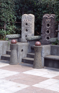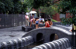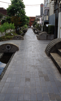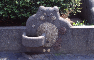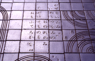 | hyaku nin isscho - 100 Tanka-Gedichte von 100 Autoren: so könnte diese Promenade auch betitelt werden, denn diese Gedichte (übrigens eine japanweit bekannte Sammlung von Tankas) findet man in den Keramikfliesen. Man muß schon mit offenen Augen diese Promenade entlang gehen um alle zu finden, aber bei dieser Gelegenheit entdeckt man unzählige kleine niedliche Details, die besonders bei den Kindern sehr beliebt sind. Eigentlich könnte man Yoga-Promenade (die japanische Bezeichnung unterscheidet sich nur durch die japanisierte Aussprache des englischen Wortes) als großen Spielplatz bezeichnen, ohnehin eine immer seltener werdende Einrichtung in Tokyo. Atelier Zo, das in den 80er Jahren des 20. Jhdt´s zu den Avantgarde-Büros zählte, entwarf hier ein erleb- und bespielbares Kunstwerk, das regelrecht zum Entdecken einläd: das Bild links unten zeigt eines dieser Miniaturen, das in der Orginalgröße gerade einmal 3cm mißt; genauso findet man Elektrostecker in Keramik und andere Dinge. ein weiteres Thema, das sich durch die ganze Promenade zieht ist Wasser: offene Rinnen, aufgestaute Bereiche, Brunnen usw. alle mit Keramikfliesen oder "Waschbeton-Mosaik". Da die Promenade zum Teil gut eingegrünt ist, kann man auch an heißen Tagen schön durchspazieren. | |||||||||||